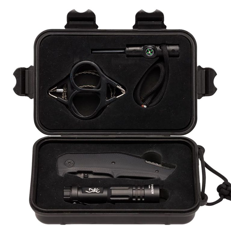 Browning 3220288 Outdoorsman Survival Kit 3.50″ Folding Drop Point Plain Black Stonewashed 8Cr13MoV SS Blade/Black G10 Handle Includes Storage Case/Flashlight/Wire Saw/Fire Flint/Compass/Whistle