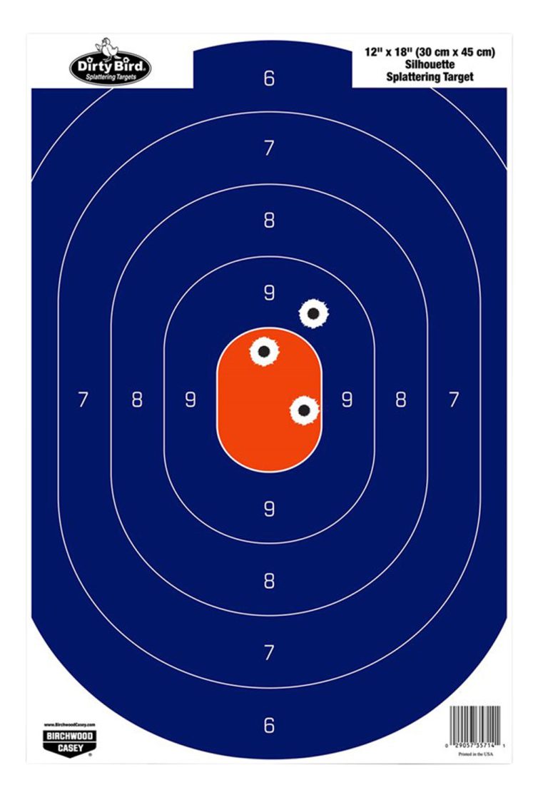 Birchwood Casey 35720 Dirty Bird Silhouette Tagboard Hanging Pistol 12″ x 18″ Blue/Orange White Impact Splatter 50 Per Pkg