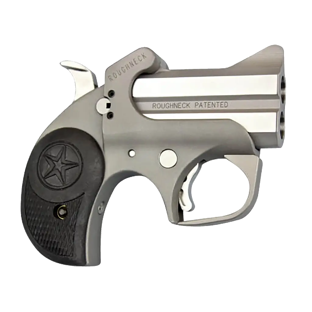The compact, yet rough-looking, Roughneck is a new type of Bond Arm gun. This model is built with a 2.5 barrel and chambered for .45 ACP. It features a stainless steel double-barrel and frame, is compatible with all standard Bond Arms barrels, and has a patented rebound hammer. It also features a spring-loaded, cammed locking lever, retracting firing pins, and cross-bolt safety.