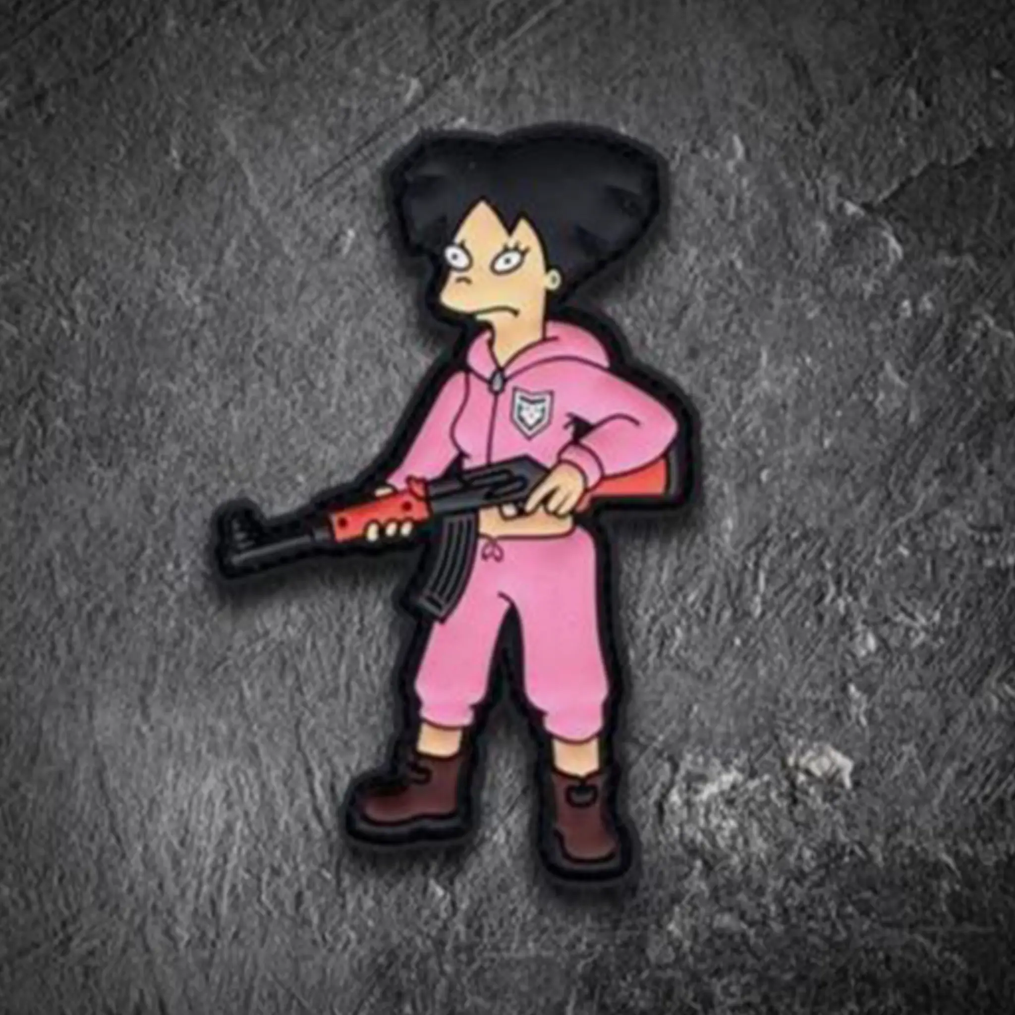 This patch flips expectations on their head. Amy Wong from Futurama shows up in a pink tracksuit, boots on the ground, AK at the ready — because underestimating her would be a very bad plan.