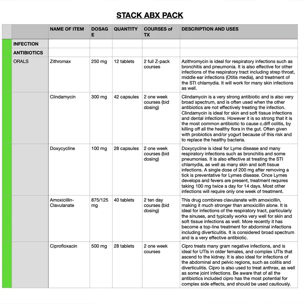 The Dr. Prepper STACK ABX MedPack is our most affordable option for preppers who are simply looking to stockpile the essential antibiotics for SHTF scenarios.