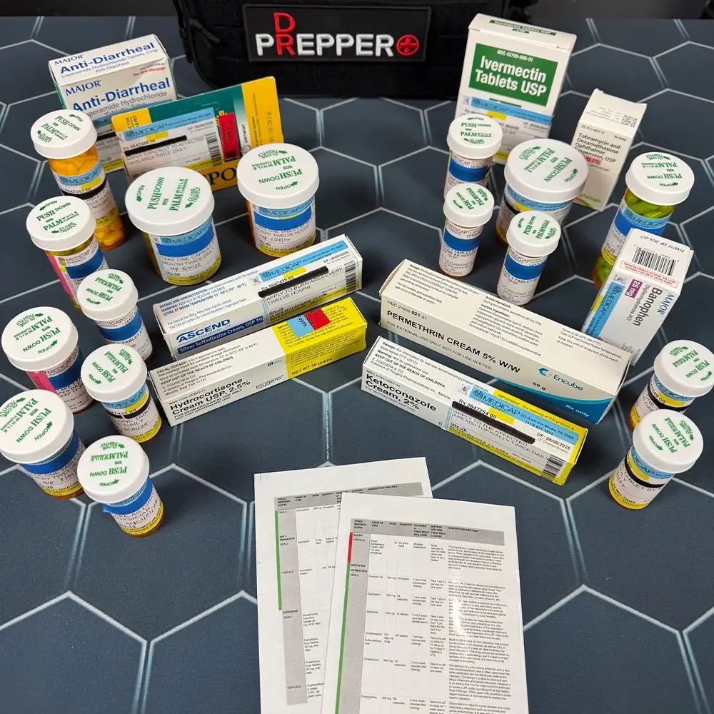 The STACK MedPack ALPHA is a comprehensive supply of medications that are ideal for preppers to have on hand in case of emergencies. There are 9 different courses of antibiotics, with repeat courses of the most important 5. There are also antivirals, antifungals, and antiparasitis that include the difficult to obtain Ivermectin. Additional medications cover for exposure related illnesses such as allergic reactions, as well as general medications for pain, n/v/d, and more. A 4×6 laminated insert helps instruct preppers on medication dosing and the types of conditions that tend to respond well to that medication.